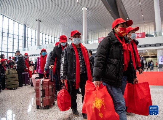 2月16日,返崗務(wù)工人員在重慶西站候車(chē)廳排隊(duì)前往檢票口,免費(fèi)乘坐復(fù)工專(zhuān)列前往廣東省返崗務(wù)工。新華社記者 唐奕 攝